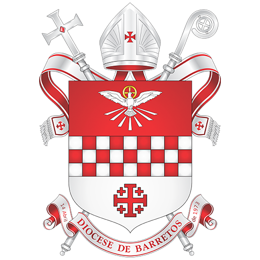 O escudo tem o formato clássico terciado por faixa de vermelho e prata e obedece às regras heráldicas. O metal prata e o esmalte vermelho do brasão simbolizam, segundo o autor, o amor ao próximo e o fogo da caridade. A figura distintiva e emblemática do Divino Espírito Santo não poderia faltar no brasão escolhido. Por meio da figura de uma pomba, o Divino Espírito Santo, Terceira Pessoa da Santíssima Trindade, é o padroeiro diocesano.