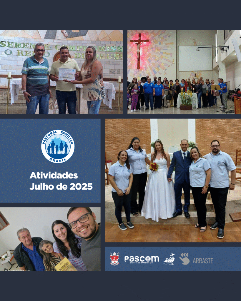 Julho foi um mês marcado por inúmeras atividades da Pastoral Familiar na Diocese de Barretos, sempre tendo como norte sua missão de apoio, acompanhamento e evangelização das Famílias. Dentre as atividades realizadas, destacaram-se os encontros semanais e de encerramento da Catequese Matrimonial, preparação e celebração de Matrimônio, palestra Catequese Pós-Matrimonial, reunião mensal, reunião de preparação da Semana da Família e Missa com casais, Terço da Capelinha da Sagrada Família, Terço nas casas, Casamento Comunitário, Missa das Famílias, retiro de casais, Terço da Sagrada Família, noite das Famílias, encontro com Famílias em Comunidades Rurais, encontro com Famílias da Catequese e encontro com casais.